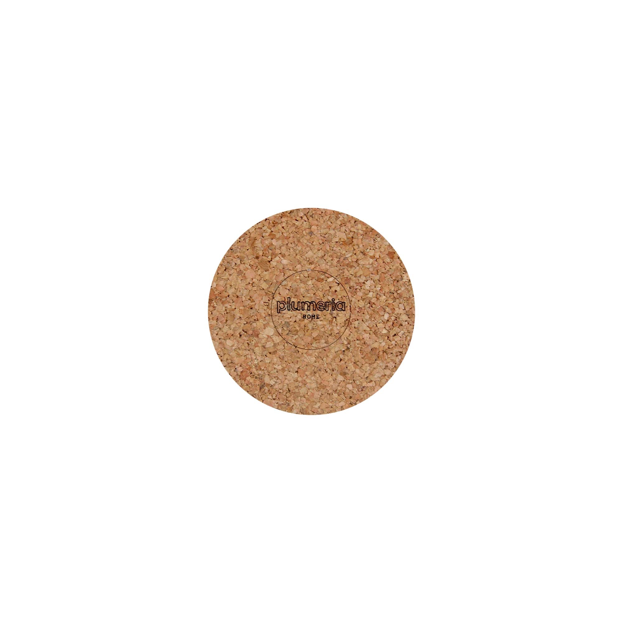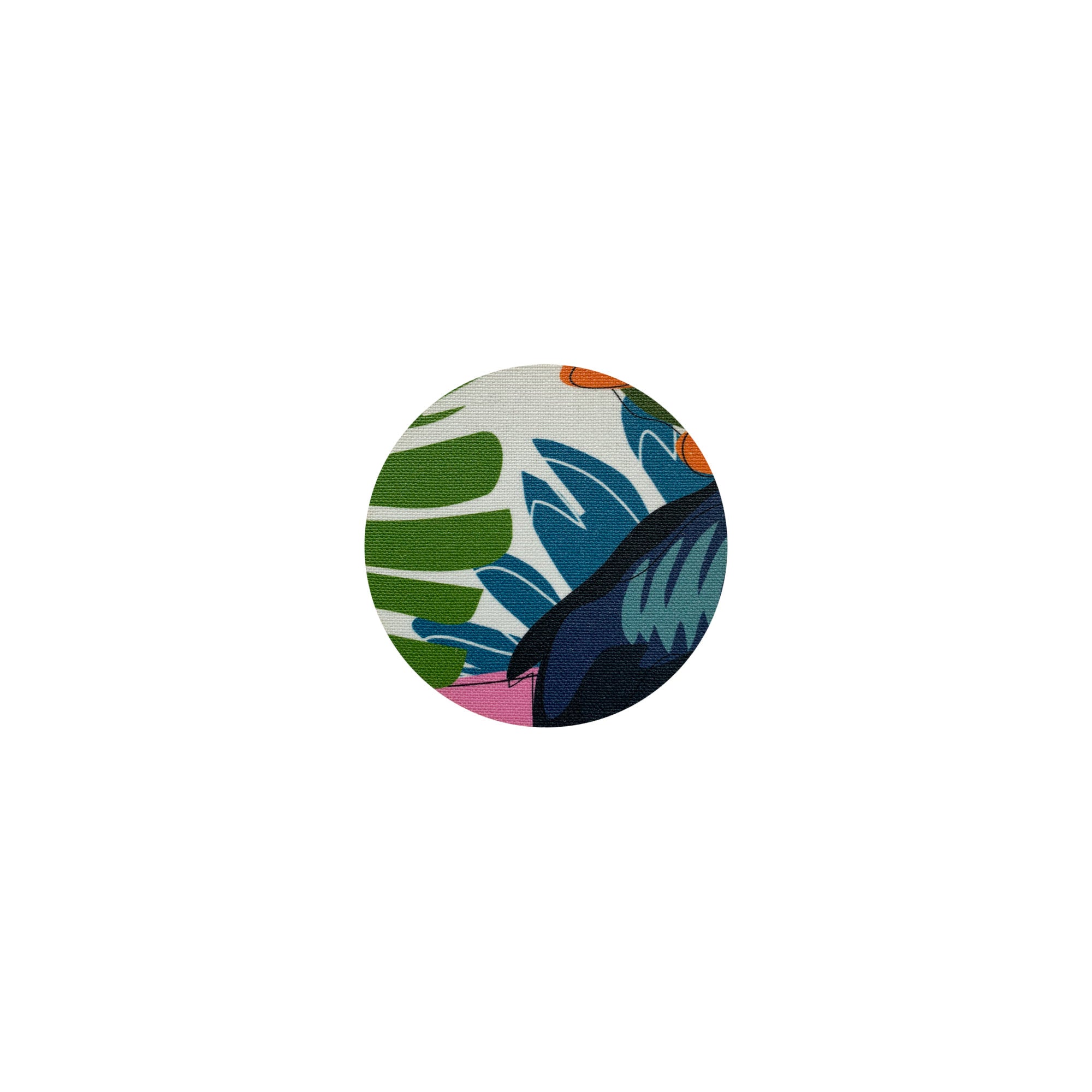 Sottobicchiere in fibra di legno, sughero naturale, tessuto di cotone in cui si ripetono frammentati di pappagalli, tucani e fiori tropicali.