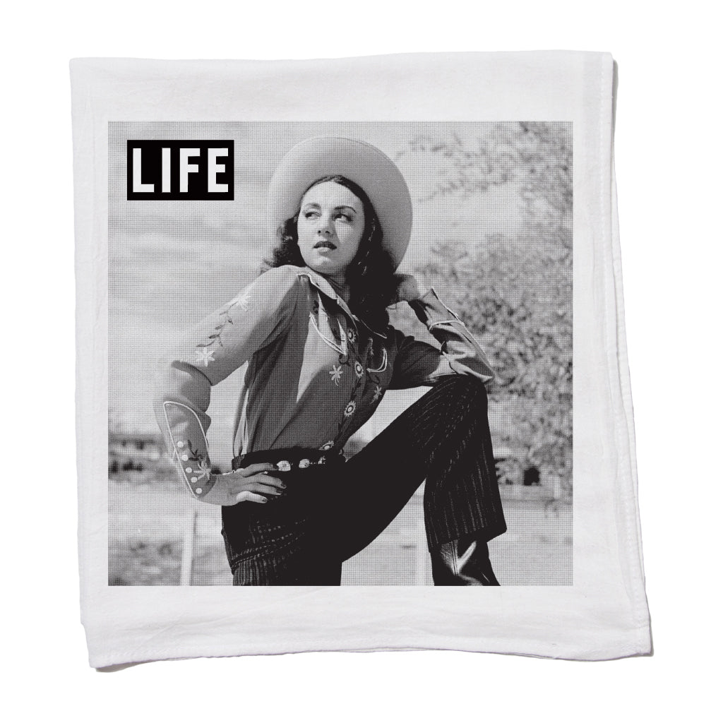 Cowgirl. This product is part of our exclusive collaboration with the photo library. A Portion of All RAYGUN Sales Raise Money For . Brite Red & Black Screen Print on a 28" x 29" flour sack kitchen towel. Designed and printed by at RAYGUN.