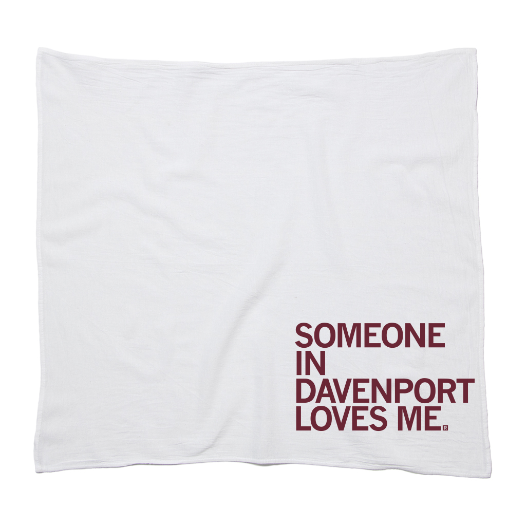 Someone in Davenport Loves Me. Maroon screen print on a 28" x 29" flour sack kitchen towel. Designed and printed by at RAYGUN.