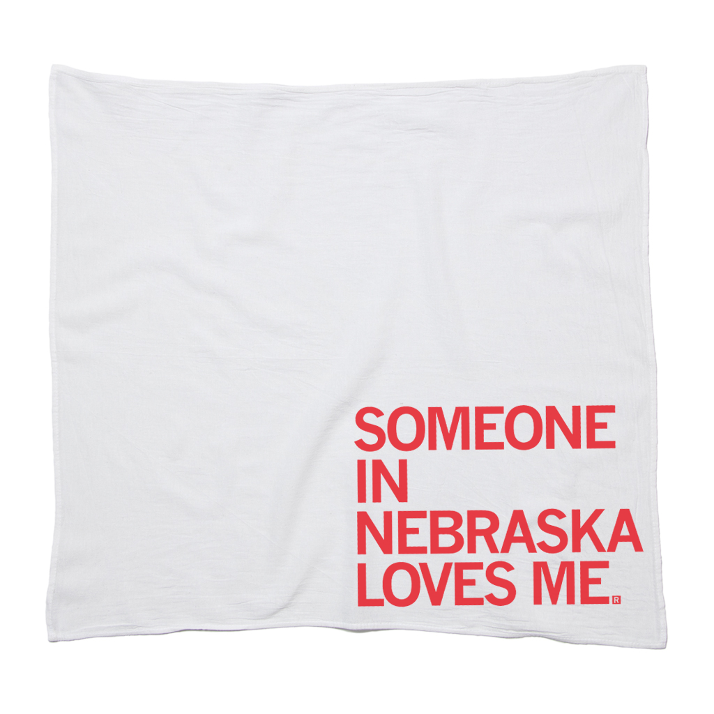 Someone in Nebraska Loves Me. Red Screen Print on a 28" x 29" flour sack kitchen towel. Designed and printed by at RAYGUN.